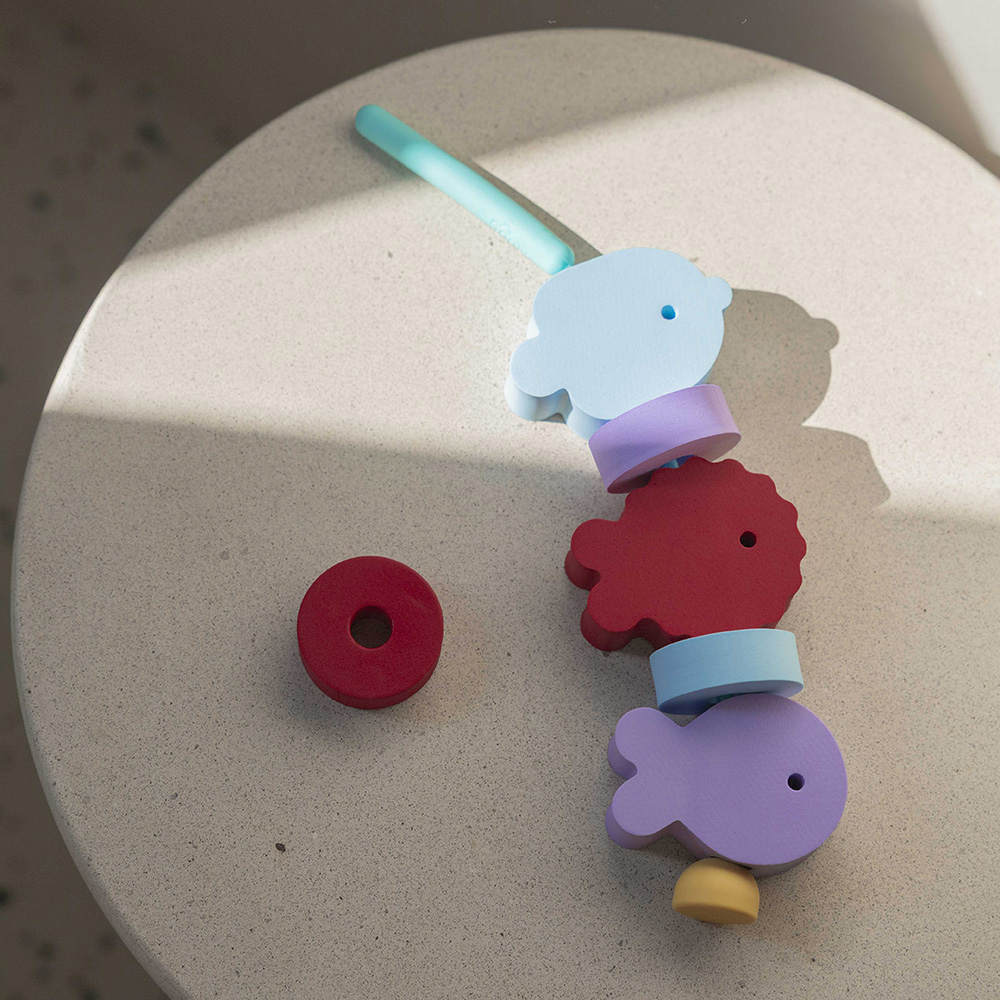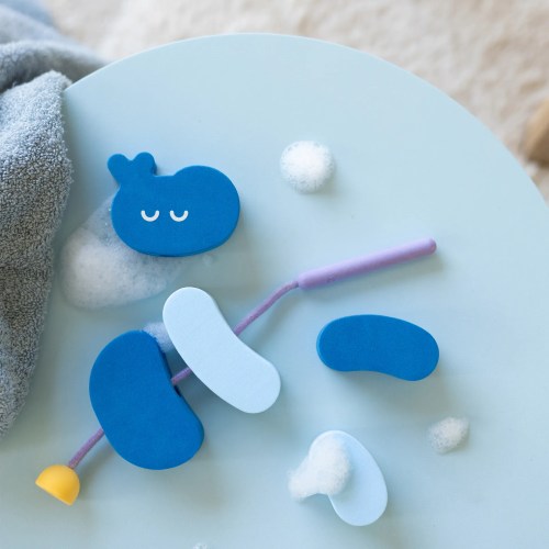 A partir de 10 mois votre enfant pourra s’amuser avec les grandes formes en mousse qui flottent sur l’eau et qui se collent à la paroi de la baignoire ou de la douche. A partir de 18 mois / 2 ans il pourra travailler l’enfilage des formes avec l’aiguille toute douce en silicone, ce qui améliorera sa motricité fine et stimule sa créativité et son imagination. Utilisez la ventouse pour fixer la création de votre enfant sur la paroi de la baignoire et apportez une touche déco qui fera sensation.